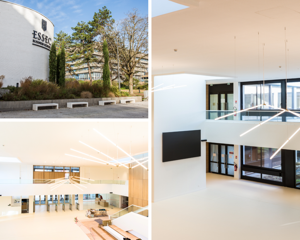 Le projet, financé par l’ESSEC et porté par M. Éric Baillet et M. Stéphane Busière, visait à moderniser cet espace central du campus, parcouru par tous les visiteurs : étudiants, enseignants, partenaires …